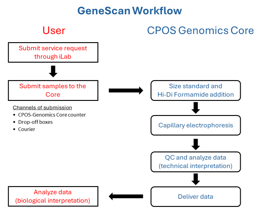 - Submit samples to the CPOS reception counter (6-02) with hard copy of GeneScan Sample Submission Form.