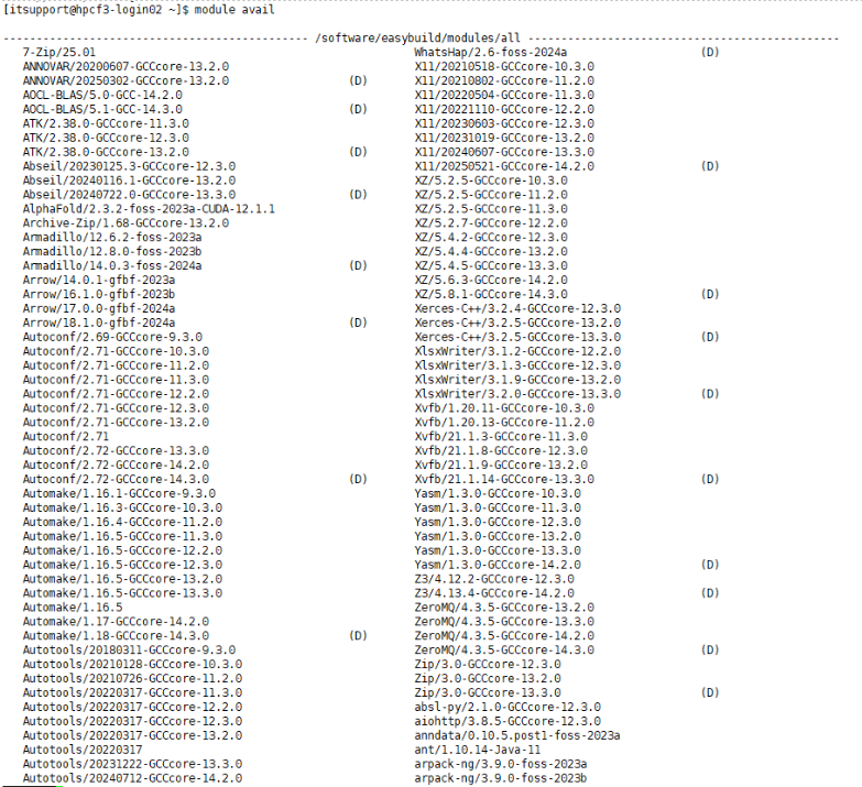 Environment modules allow users to dynamically switch between software environments with a few simple commands. To know which software packages and their versions are available on the cluster, use the command “module avail” to list out all available module environments: